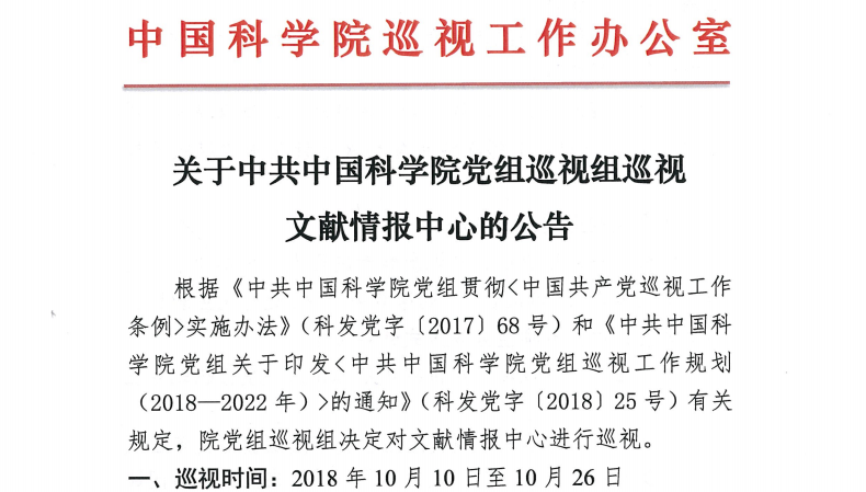 关于中共中国科学院党组巡视组巡视文献情报中心的公告
